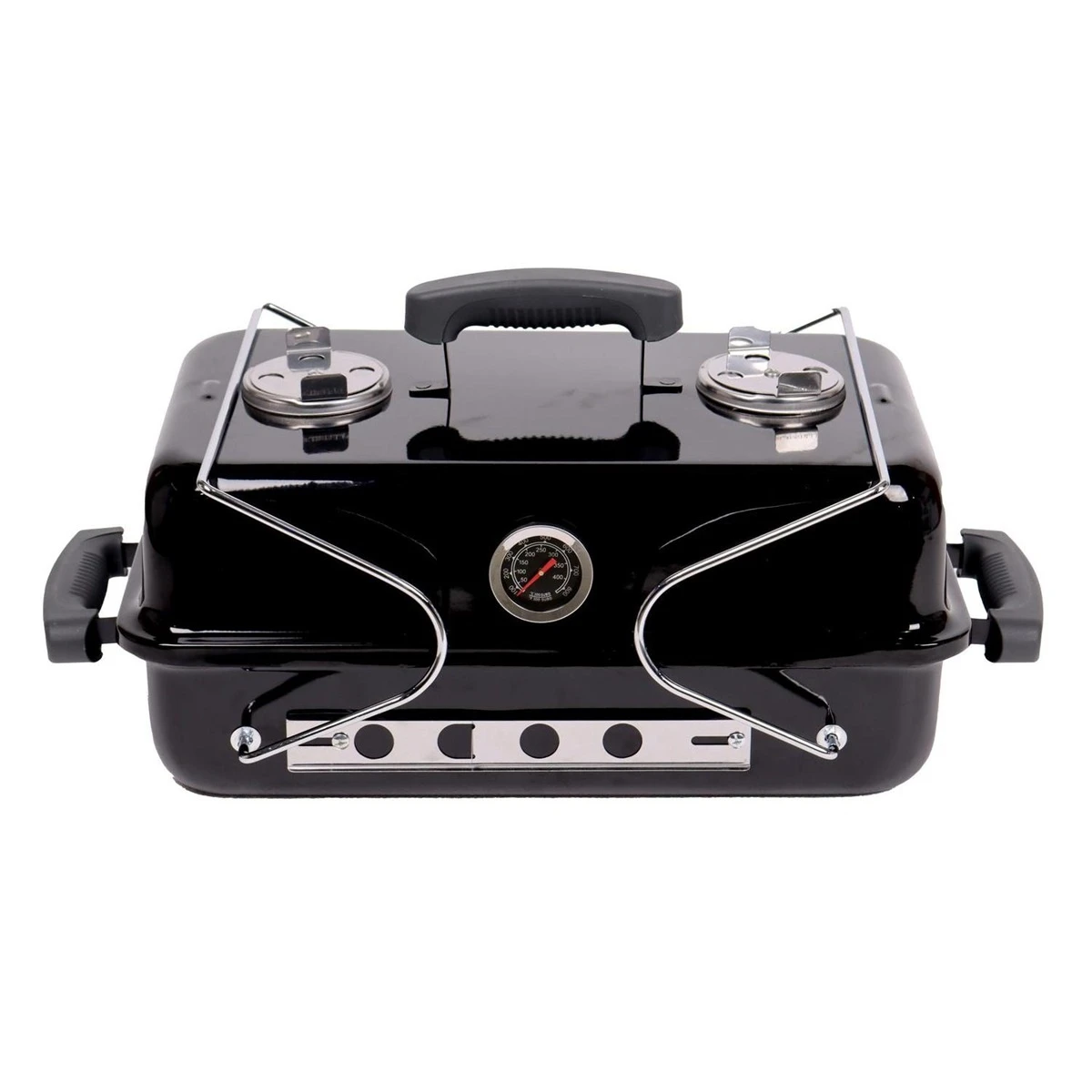 Ben ben je klaar en is de BBQ afgekoeld, dan sluit je met de beugels het deksel weer stevig dicht zodat je de BBQ weer veilig mee kunt nemen.